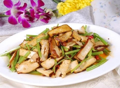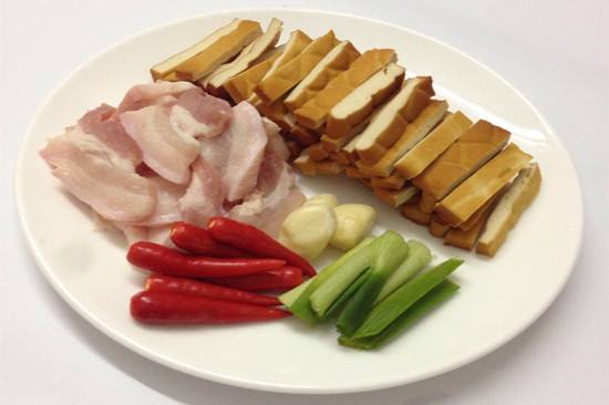 2、攸縣香干洗凈瀝水后切成5毫米厚度的片狀,紅辣椒洗凈切成小圈,青蒜分紅白,綠兩部分,別離切成斜段。